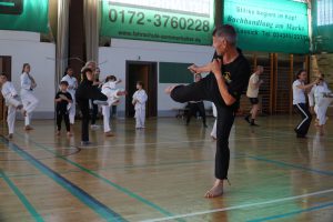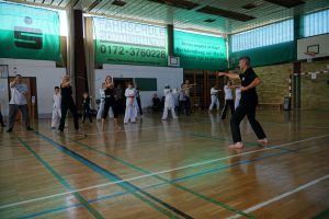 Henry gab während der einführenden Erwärmung Einblicke in FTM, das kampfsportorientierte Selbstverteidigungs-Fitness-Training mit Power-Musik.